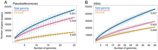 Graphs showing the calculated pangenome sizes of Pseudoalteromonas and Vibrio relative to the number of added genomes. For Pseudoalteromonas (A) and Vibrio (B), the number of gene clusters continues to grow as more genomes are added to the analysis, which shows that the chromids, chromosomes and total genomes are open. Each data point in the graph is based on the median of pangenome size of 100 randomly generated datasets (strain orders). The Heaps’ exponents are shown associated with each graph and are used to evaluate the openness of the genomes.