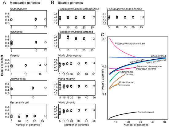Plots with Heaps’ exponent relative to the number of genomes for monopartite genomes are presented in Figure 4A. When the number of genomes is small, the distribution of Heaps’ exponent is wide for Yersinia, Alteromonas and Rodentibacter, whereas for Idiomarina, the distribution is smaller. The corresponding plots for Vibrio and Pseudoalteromonas, show that the Heaps’ exponent is widely distributed when only a few numbers of genomes are included in the datasets (Figure 4B). As the number of genomes increases, the exponents are less distributed (see Table S3 for complete list of Heaps’ exponents). Similarly, the calculations for Pseudoalteromonas chromids vary greatly for small datasets but become more stable as the number of included genomes increases. These results show, as expected, that larger dataset (>10 genomes) result in more stable Heaps’ values.
