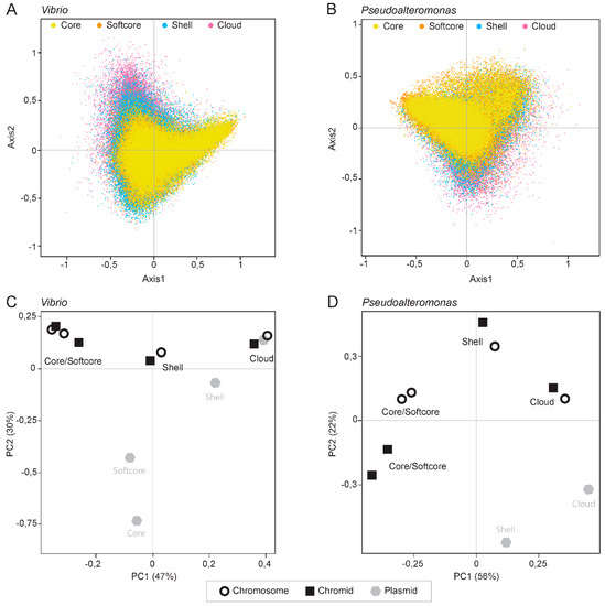 Correspondence analysis of relative synonymous codon usage (RSCU). The analyses are based on 50 Vibrio (A) and 26 Pseudoalteromonas (B) genomes. Core, softcore, shell and cloud genes are indicated with yellow, orange, blue and pink colors, respectively. The genes are distributed on primary and secondary axes which account for 10.98% and 8.07% in Vibrio and 10.97% and 7.52% Pseudoalteromonas of the total variation. Principal component analysis PCA) plots of the RSCU data from Vibrio (C) and Pseudoalteromonas (D) are shown. Both type of plots show that codon usage is specific for each pangene category rather than type of replicon.