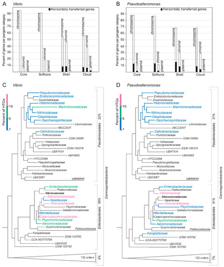 The number of HTGs detected for each pangene category on each replicon is presented in Figure 6A,B. HTGs comprise 11% and 23% of the total number of genes in the pangenomes in Vibrio [24,529 genes/7308 gene clusters (12 core, 32 softcore, 1496 shell, 4765 cloud)] and Pseudoalteromonas [19,970 genes/4310 gene clusters (309 core, 424 softcore, 2510 shell, 2389 cloud)], respectively. In Vibrio, the majority of HTGs (98%) are shell or cloud genes. These are distributed on the chromosome, where they make up 15% of shell and 13% of cloud genes, and on the chromid where they make up 20% (shell) and 16% (cloud). Notably, the Vibrio dataset contains 35 plasmids (from 19 genomes), of which 27% of shell genes and 13% of cloud genes are HTGs. For Pseudoalteromonas, about half of the HTGs are core and softcore genes. Of these, 15% and 18% of softcore genes are distributed on chromosomes and chromids, respectively. The other half of HTGs corresponds to chromosomal genes where they make up 24% of shell and 12% of cloud genes, respectively, and the corresponding numbers for chromidal genes are 30% (shell) and 13% (cloud). Six genomes contain one plasmid each. Here, 30% of HTGs represent shell and 14% represent cloud genes.