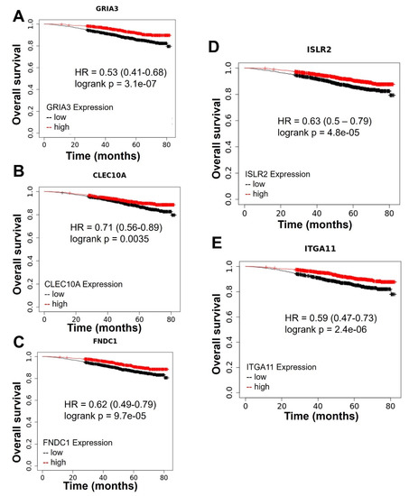 Differential expression analysis revealed a list of genes (GSE211290) differentially expressed in control tumors vs. tumors from mice treated with MSU-42011 vs. tumors from mice treated with bexarotene. This list of 289 significantly (padj < 0.05) upregulated or significantly downregulated genes was sorted by adjusted p value. Of the top 10 most significant differentially expressed genes, high levels of expression of five genes correlate with improved overall survival in breast cancer patients—GRIA3 (logrank p = 3.1 × 10−7) (Figure 2A), CLEC10 (logrank p = 0.0035) (Figure 2B), FNDC1 (logrank p = 9.7 × 10−5) (Figure 2C), ISLR2 (logrank p = 4.8 × 10−5) (Figure 2D), and ITGA11 (logrank p = 2.4 × 10−6) [23] (Figure 2E). Survival curves were generated using the Kaplan–Meier Plotter (KmPlot) [24], without further stratification of breast cancer patients. These genes code for a glutamate receptor linked to migration and invasion (GRIA3) [25]; a c-type lectin with a role in cellular adhesion, signaling, and inflammation which serves as a dendritic cell marker (CLEC10) [26]; a fibronectin protein associated with invasion and chemoresistance (FNDC1) [27]; a member of the immunoglobulin superfamily which participates in nervous system development (ISLR2) [28]; and an alpha integrin which regulates adhesion to the extracellular matrix and the organization of collagen (ITGA11) [29].