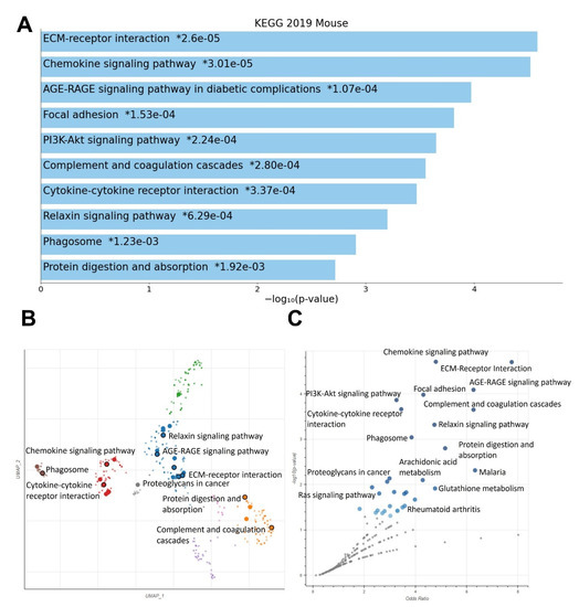 Enrichment analysis on control vs. MSU-42011 vs. bexarotene differential expression data using EnrichR reveals a set of pathways regulated by treatment with the various RXR agonists (Figure 3). The KEGG 2019 mouse database was used for these analyses; analysis using the Wikipathways 2019 mouse database is also shown (Supplemental Figure S1). Identified pathways include genes associated with ECM-receptor interaction, chemokine signaling, focal adhesion, PI3K-Akt signaling, complement and coagulation cascades, and the phagosome. Genes within these pathways encode for macromolecules involved in cellular structure and function, cellular behavior such as adhesion and migration, and downstream signaling pathways.