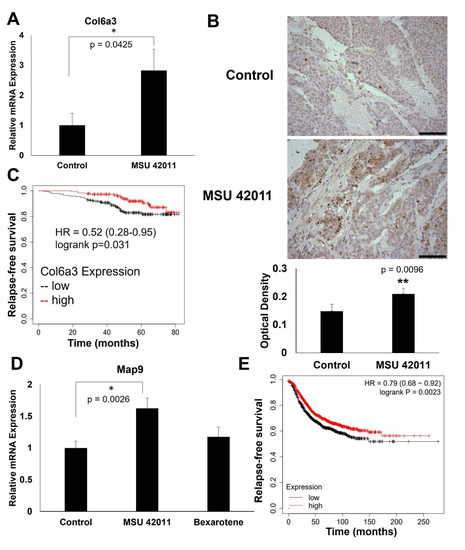Several genes were selected from the differential expression analysis for validation of mRNA expression by qPCR and protein levels by IHC. Collagen type VI a3 chain (COL6A3) is an extracellular matrix protein which is altered in several types of cancer [32]. Col6a3 mRNA expression (Figure 5A) is increased in tumors treated with MSU-42011 (p = 0.0425) but not in tumors treated with bexarotene. IHC (Figure 5B) demonstrates a 41% increase in Col6a3 protein levels in tumors treated with MSU-42011 (p = 0.0096), and no apparent increase in Col6a3 in bexarotene-treated tumors (Supplemental Figure S2D). Kmplot was used to investigate the relevance of Col6a3 expression in human breast tumors (Figure 5C). High expression of COL6A3 is correlated with increased relapse-free survival (p = 0.031) in HER2+ breast cancer patients. qPCR (Figure 5D) also confirms a significant (p = 0.0026) increase in Map9 mRNA in MSU-42011-treated tumors, while there was no significant increase observed in bexarotene-treated tumors. MAP9 is a microtubule-associated protein which regulates cell cycle and the DNA damage response [33]. High expression of MAP9 is positively correlated with relapse-free survival (Figure 5E) in breast cancer patients (p = 0.0023).