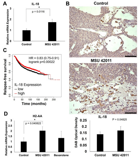 Interestingly, tumors from the bexarotene group display an apparent paucity of IL-18, even in comparison to control tumors (Supplemental Figure S2B). Importantly, Kmplot analysis reveals that high IL-18 expression is correlated with increased relapse-free survival in breast cancer patients (p = 0.00022) (Figure 6C). MSU-42011-treated tumors also demonstrate a significant (p = 0.040822) upregulation of the gene coding for major histocompatibility complex (MHC) component H2-AA by qPCR (Figure 6D).