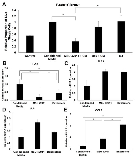 RXR agonists regulate pathways relevant to the function of the immune system, such as rheumatoid arthritis, complement and coagulation cascade, and cytokine–cytokine receptor interaction. To validate and further characterize the immunomodulatory activity of these compounds, BMDMs treated with RXR agonists were evaluated for expression of cancer-relevant genes within these pathways. Monocytes were harvested and differentiated with MCSF (20 ng/mL). On Day 5, BMDMs were treated with conditioned media from E18-14C-27 cells, derived from MMTV-Neu mammary tumors, to induce a tumor-educated macrophage phenotype. BMDMs were treated with conditioned media alone, or with 300 nM of either MSU-42011 or bexarotene. After 24 h, the relative proportion of F4/80+CD206+ macrophages was significantly (p = 0.02726) lower in BMDMs treated with conditioned media and 300 nM MSU-42011 compared to conditioned media alone (Figure 7A) In comparison, treatment with 300 nM bexarotene and conditioned media did not significantly alter the relative proportion of F4/80 + CD206+ BMDMs (p = 0.9423). Treatment with 300 nM of either RXR agonist significantly (p = 0.0016) decreased mRNA expression of IL-13, an immunosuppressive cytokine (Figure 7B). A trend of increasing TLR9 and IRF1 mRNA expression, associated with a pro-inflammatory, anti-tumor phenotype was observed in BMDMs treated with both RXR agonists (Figure 7C,D). RXR agonists also induce a significant (p = 0.00015) increase in expression of CCL6, a pro-inflammatory cytokine (Figure 7E).