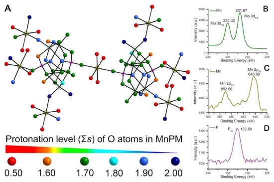 The valence of Mo, Mn, and P in MnPM has been further investigated by using X-ray photoelectron spectrum (XPS). As shown in Figure 2B, there are two broad peaks located at 235.02 and 231.87 eV, which can be assigned to Mo 3d3/2 and Mo 3d5/2, respectively [], which may indicate that Mo with +6 exist in MnPM. As can be seen in Figure 2C, the XPS spectrum includes two wide peaks at 640.50 and 652.66 eV that can be assigned to Mn 2p3/2 and Mn 2p1/2, respectively []. These results suggest that the +2 valence Mn ions are present in MnPM. As shown in Figure 2D, there is one peak located at 132.50 eV assigned to P2P, which may imply that the valence of P is +5 []. Those XPS results are consistent with the results of BVS calculation.
