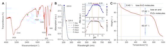 (A) IR spectrum for (H2en)3[Mn(H2O)4][Mn(H2O)3]2[P2Mo5O23]2·14.5H2O (MnPM). (B) The UV-vis spectrum of MnPM in ultrapure water. Additionally shown: the variation of the peak intensities with pH of the solution (inset figure). (C) The thermogravimetric analysis (TGA) curve of MnPM from 25 to 1000 °C.