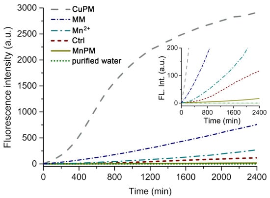 DCF is a probe derived from non-fluorescent 2′,7′-dichlorofluorecin (DCFH) by the reaction with ROS in the presence of horseradish peroxidase, which can reveal the generation of ROS from the system by special fluorescent emission at 650 nm []. As shown in the inset of Figure 4, the DCF fluorescence intensity of MnPM is lower than that incubated with the blank group (Ctrl) from beginning to end, which may imply that the total ROS in the system with MnPM is far less than that without MnPM. Those results may suggest that MnPM possesses SOD-like activities in terms of scavenging free radicals.