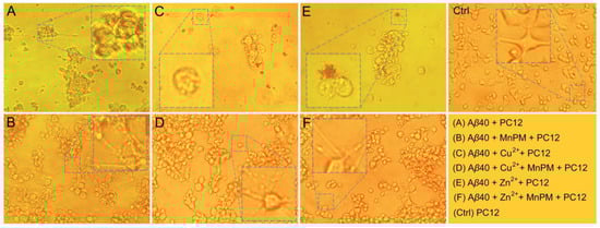 Photomicrographs microscopy images of PC12 cells after incubation with Zn2+- or Cu2+-induced Aβ40 aggregates with or without MnPM (Aβ40 = 20 μM, MnPM = 20 μM, [Cu2+] = [Zn2+] = 40 μM) (inset: partial enlarged detail. All the samples with final DMSO content: volume ratio 0.5%).