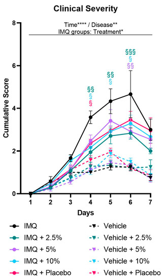 Based on the cumulative PASI scores, we observed a more severe psoriasiform-like inflammation on days 4 to 6 compared to non-psoriatic controls (p ≤ 0.0411) in all treatment groups. Remarkably, two-way ANOVA analysis of clinical severity scores revealed a significant interaction between time and treatment in the IMQ groups (p = 0.0316). Analyzing single days revealed that placebo alleviated the inflammation on day 4 (p = 0.0469) and showed a trend towards reduced severity scores on day 5 (p = 0.0544) compared to untreated IMQ-induced psoriasis. In addition, 5% diacerein reduced the clinical severity only on day 6 (p = 0.0024). Further, 2.5% and 10% diacerein attenuated the clinical severity from days 4–6 [2.5%: p = 0.0023/0.0039/0.0007; 10%: p = 0.0129/0.0331/0.0425; (day 4/5/6)] compared to untreated psoriatic skin. Importantly, analyzing the whole 7-day treatment period, multiple comparison tests showed that 2.5% diacerein diminished the clinical severity compared to untreated IMQ-induced psoriasis (treatment main effect, p = 0.0072) (Figure 1, Supplementary Figures S3 and S4, Supplementary Table S4).