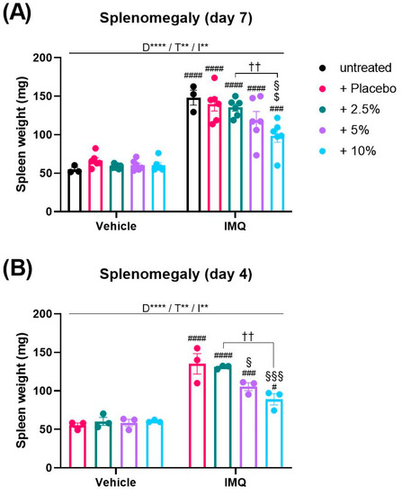 As psoriasis is characterized by a systemic inflammation [4,19] which is recapitulated by the IMQ model as splenomegaly [8], we analyzed the spleens of mice at the end of the experiment to investigate a possible systemic effect of diacerein. Two-way ANOVA analysis of the spleen weight revealed a significant interaction between disease and treatment on day 7 (p = 0.0063). In general, IMQ treatment induced an enlargement of the spleen compared to non-psoriatic animals (IMQ main effect, p < 0.0001). Remarkably, multiple comparison analysis showed that 10% diacerein attenuated the IMQ-induced splenomegaly in comparison to untreated (p = 0.0006) and placebo-treated (p = 0.0005) psoriasis (Figure 2A).