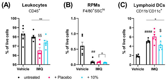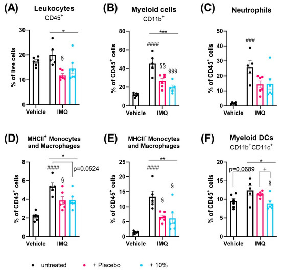 Interestingly, topical treatment of the psoriatic skin with placebo, but not diacerein, significantly reduced the overall fraction of CD45+ cells in the spleen and skin compared to untreated psoriasis (p = 0.0017 and p = 0.0122;) (Figure 3A and Figure 4A). The majority of immune cell types in the spleen and skin were unaffected by either diacerein or placebo treatment (Supplementary Figures S8 and S9). However, 10% diacerein decreased numbers of RPMs (p = 0.0210) and lymphoid CD11c+ DCs (p = 0.0214) in the spleen compared to placebo treatment (Figure 3B,C). In the skin, both diacerein and placebo treatment diminished the fraction of CD11b+ myeloid cells (p = 0.0006 and p = 0.0054, respectively) (Figure 4B), showed a trend to diminish neutrophil cell numbers (p = 0.0938 and p = 0.0806, respectively) (Figure 4C), and reduced the IMQ-induced increase in MHCII+ (p = 0.524 and p = 0.0490, respectively), as well as MHCII- (p = 0 0127 and p = 0.0192, respectively) monocytes/macrophages (Figure 4D,E) compared to untreated psoriatic skin. Remarkably, diacerein treatment additionally decreased the number of CD11b+CD11c+ skin myeloid DCs compared to IMQ alone (Tukey’s test, p = 0.0257) or to placebo (unpaired t-test, p = 0.0113), whereas placebo treatment had no effect on immune cell populations compared to untreated psoriatic skin (Figure 4F).