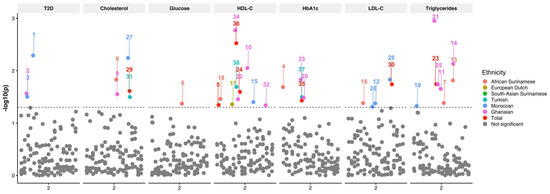 Type 2 diabetes mellitus (T2D) is a highly prevalent and complex metabolic disorder affecting millions of people worldwide [1]. T2D is characterized by insulin resistance accompanied by progressive pancreatic β-cell failure, leading to hyperglycemia [2]. Additionally, it is known that approximately 50% of T2D patients develop dyslipidemia, resulting in increased fasting triglycerides (TG) and low-density lipoprotein cholesterol (LDL-C) concentrations, as well as decreased high-density lipoprotein cholesterol (HDL-C) concentrations [3,4,5,6]. The combination of hyperglycemia and dyslipidemia is a strong driver of cardiovascular disease. Furthermore, while the global prevalence of T2D is on the rise, it also appears that there are differences in the risk of developing T2D, dyslipidemia, and associated cardiovascular complications across ethnic groups [7,8], which may be caused by differences in the genetic background of individuals. Indeed, several genome-wide association studies (GWASs) have linked multiple single-nucleotide polymorphisms (SNPs) to T2D [9] and dyslipidemia [10]. However, many of these GWASs have been conducted in mostly European descent populations and provide less insight into the contribution of genetics to differences in T2D and dyslipidemia across ethnic groups.