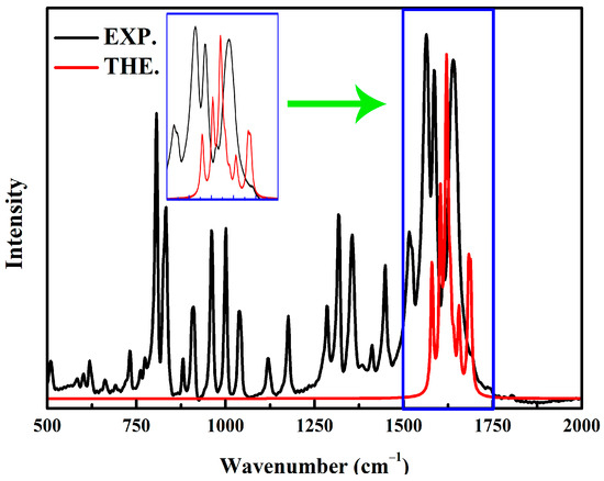 Due to the fact that NO2 asymmetric stretching modes ranging from 1500 cm−1 to 1700 cm−1 are often used in the vibrational probes of energetic materials [21,22], details of the vibrational assignment of the NO2 asymmetric stretching vibration are presented in Figure 1 and Table S2. The theoretical anharmonic IR peak at 1640.8 cm−1 is consistent with our experimental value of 1639.5 cm−1 and other reports [13,14,17,18], and it is attributed to the NO2 asymmetric and furazan ring stretching vibration in DNTFⅣ; however, there is an obvious difference in the relative strength. The theoretical anharmonic IR peak at 1612.0 cm−1 is ascribed to the NO2 asymmetric and furazan ring stretching vibration in DNTFⅡ, which is in agreement with the experimental value of 1612.5 cm−1 [13,14,17,18]. Moreover, there is a relatively strong experimental peak at 1586.4 cm−1 [13,14,17,18] that is confirmed by the theoretical IR peak at 1579.7 cm−1. This is contributed by the NO2 asymmetric and furazan ring stretching vibrations in DNTFⅡ and the NO2 asymmetric stretching vibrations in DNTFⅣ. However, some theoretical IR peaks have not been reported in experiments. For example, the theoretical peak at 1623.2 cm−1 is attributed to the NO2 asymmetric and furazan ring stretching vibration in DNTFⅢ and the furoxan ring stretching vibration in DNTFⅠ. The theoretical peak at 1640.8 cm−1 is ascribed to the NO2 asymmetric and furazan ring stretching vibrations in DNTFⅣ. Through the above comparisons of the structures and IR peaks, the conclusion is that the optimized DNTF structure can well reproduce the experimental one, despite some differences.