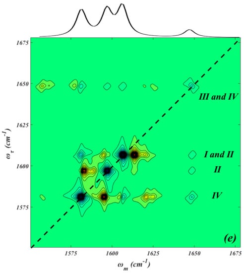 The calculation of quasi-static 2D IR spectra has been described in detail elsewhere [25,31]. In summary, the ground-state, two-exciton, and combination band frequencies of the asymmetric NO2 stretching modes were used to construct the two-exciton Hamiltonian, where the anharmonicity was calculated with the use of anharmonic frequencies; the two-exciton Hamiltonian was subsequently diagonalized. The transition dipole moment vectors between the vibrational ground state and the one-exciton state for each of the normal modes were acquired from the DFT results [34]. Then, the harmonic approximation, that is, the corresponding ground state of one-exciton state transition dipole moment vector multiplied by √2 42, was used to calculate the transition dipole moment vector between the one-exciton and two-exciton states. Moreover, the waiting time Tw was set to 3.0 ps. In a given vibrational mode, the fourth power of the transition dipole moments involved is generally proportional to the 2D IR diagonal peak intensity [31,32].