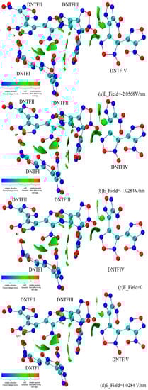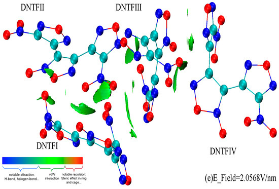In the above discussions, it was established that the vibration energy transfer usually occurs among the vibration modes, including the furazan ring stretching vibration in DNTF. Considering the fact that intermolecular vibration energy transfer is the bridge of intermolecular interactions, we opted to use the IGMH method [30,37], where the Hirshfeld partitioning of the actual molecular electron density is used to derive the atomic densities in order to be able to analyze intermolecular non-covalent interactions in the DNTF system under different E-fields (Figure 3). To maximally reveal the interactions between the DNTF molecules, the isovalue was set to 0.01 a.u. in the maps. As expected, due to the conjugation of the furoxan and furazan rings, a series of thin and broad isosurfaces appear between adjacent DNTF molecules, which ideally exhibit π-π stacking interactions and can also explain the existence of cross-peaks in the 2D IR spectra. More specifically, there are mainly π-π stacking interactions between the nitro group and the furazan ring in DNTFⅠ and DNTFⅡ; between the furazan ring connecting with the N8O2 in DNTFⅡ and the furazan and furoxan rings in DNTFⅢ; and between the furoxan ring in DNTFⅢ and the furazan ring connecting with the N8O2 and the furoxan ring in DNTFⅣ. Moreover, a van deer Walls (vdW) interaction is observed between the nitro group in DNTFⅠ and that in DNTFⅢ. Interestingly, when the direction of the E-field is opposite to the X-axis (Figure 3a,b), the area of the green isosurface between DNTFⅢ and DNTFⅣ, especially between the furoxan ring in DNTFⅢ and the furazan ring connecting with the N8O2 in DNTFⅣ (Figure 3, top right), is larger than that when the E-field is along the X-axis (Figure 3d,e); this indicates that the direction of the E-field has a significant influence on the strength of weak interactions.