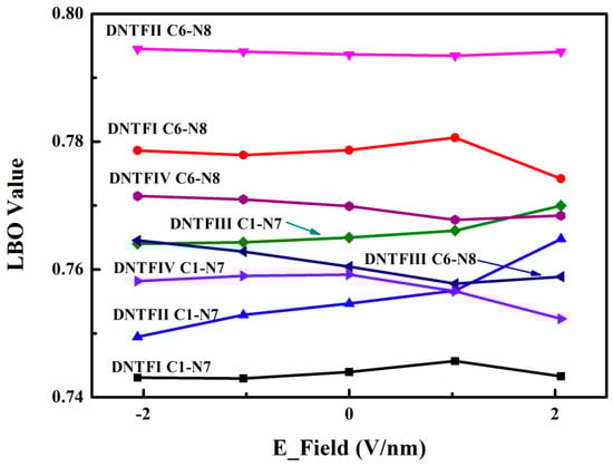 where ρ(r) denotes the electron density at point r, and wA(r) stands for an atomic weighting function and corresponds directly to the scope of the atomic space. The prefactor −10 is introduced to make the magnitude of the LBO consistent with one’s chemical intuition for typical covalent bonds. Generally, the value of the LBO is positively related to the stability of the covalent bonds. As the DNTF primitive cell contains four DNTF molecules [13,14], the LBO values of eight C-NO2 bonds are presented in Figure 4. Due to the orientation of the coordinated oxygen on the furoxan ring [13,14], the LBO values of C-N8O2 are usually larger than those of C-N7O2, which reveals that the C-N7O2 bonds tend to induce decomposition. More specifically, regardless of the E-field change, the breakdown of the C-N7O2 bond in DNTFⅠ is the first step in the thermal decomposition process. The LBO value of the C-N8O2 bond in DNTFⅡ is the largest and is almost unchanged, which may be attributed to the fact that N8O2 in DNTFⅡ has strong π-π stacking interactions with the furoxan and furazan rings in other molecules (Figure 3). When the E-field is at 1.0284 V/nm, the LBO value of the C-N7O2 bond in DNTFⅠ is the largest, demonstrating that the DNTF in this E-field is relatively more stable during the decomposition process. However, with an E-field change, the next steps in the decomposition process are competitive. For example, when the E-field is −2.0568 V/nm, the second and third steps involve the cleavage of the C-N7O2 bonds in DNTFⅡ and DNTFⅣ, respectively, which are the same as those in the absence of an E-field. Nevertheless, when the E-field is 2.0568 V/nm, the second and third steps in the decomposition process represent the cleavage of the C-N7O2 bonds in DNTFⅣ and that of the C-N8O2 bonds in DNTFⅢ, respectively.
