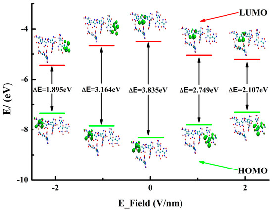The highest occupied molecular orbital (HOMO) and the lowest unoccupied molecular orbital (LUMO) play a significant role in chemical reactivity [39]. Particularly, their energy gap can reflect the chemical reactivity and optical polarizability of energy materials [40,41]. The distribution of the HOMO and LUMO of DNTF under E-fields, along with their energy gaps, is presented in Figure 5. It can be seen that the LUMO is mainly distributed on the N7O2 and the corresponding furazan ring in DNTFⅣ under negative E-fields, and that it is mainly distributed on the N8O2 and the corresponding furazan ring in DNTFⅡ in the absence of an E-field and under positive E-fields. The HOMO is contributed by the furoxan and furazan rings connecting with the N7O2 in DNTFⅡ in the absence of an E-field and under negative E-fields, but the HOMO is contributed by the furoxan and furazan rings connecting with the N7O2 in DNTFⅣ under positive fields. In addition, larger HOMO and LUMO energy gaps usually lead to lower chemical reactivity, which allows for molecules to have higher chemical stability [40,41]. It is also revealed that when the E-field is −2.0568 V/nm, the value of the energy gap is the smallest, indicating that the DNTF molecule is the most active; on the other hand, the value of the energy gap is the largest in the absence of an E-field, which suggests that the DNTF molecule has the highest chemical stability. Therefore, E-fields may be considered to have an important impact on the chemical stability and position of the HOMO and LUMO.