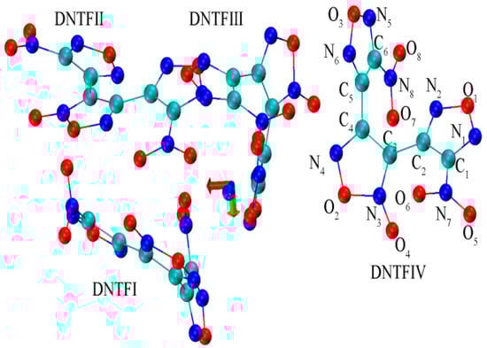 The optimized structure of the DNTF primitive cell includes four molecules, which are numbered using Roman numbers. The carbon (C), oxygen (O), and nitrogen (N) atoms are represented by blue-green, red, and blue-colored balls, respectively. Atoms in DNTFⅣ are labeled with elements and numbers, and the same rule is followed in other DNTF molecules.