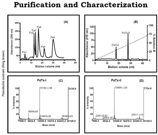 Purification and characterization of snake venom proteins. (A) Six fractions (Pa1–Pa6) were separated from the crude venom of P. australis (king brown) by a Superdex G-75 column equilibrated with 50 mM Tris-HCL buffer (pH 7.4). (B) The fractions (Pa4) containing antibacterial and PLA2 activities were further purified by reverse-phase (RP)-HPLC on C18 and resolved into six peaks (Pa-F1 to Pa-F6). The most active peak (Pa-F2) was further separated on a C8 column, producing two pure proteins, PaTx-I and PaTx-II. (C,D) Molecular weights of the svPLA2 proteins (PaTx-I and PaTx-II) were determined using MALDI-TOF/MS.