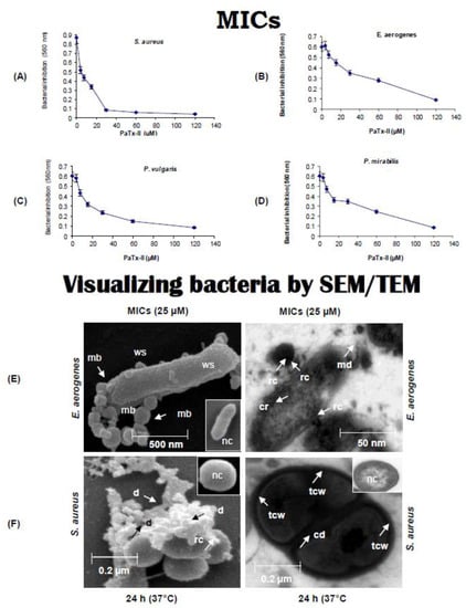 Antimicrobial potency of PaTx-II was tested against bacteria for 24 h at 37 °C. (A–D) Minimum inhibitory concentrations (MICs) were determined by standard procedures (see Methods). The inhibitory effect of PaTx-II was shown against S. aureus (MICs 25 µM), P. vulgaris (MICs 28 µM), P. mirabilis (MICs 35 µM) and E. aerogenes (MICs 25 µM); svPLA2 shows the most potent inhibitory effect at the lowest dilutions. (E,F) Ultrastructural (scanning and transmission electron microscope) micrographs reveal that the PaTx-II-treated (MIC, 25 µM) bacteria show membrane blebs (mb), cell roughening (cr), debris (d), release of cellular contents (rc), wrinkled surfaces (ws), thickened cell walls (tcw), membrane damage (md) and cell death (cd) at the septal region after 24 h at 37 °C. Untreated normal cells (nc, insets) show none of these features.
