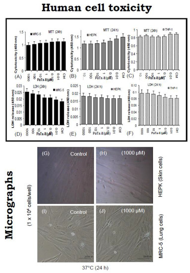 The 2.5-diphenyl-2H-tetrazolium bromide (MTT) assay was used to measure cellular metabolic activity as an indicator of cell viability, proliferation, and cytotoxicity. Skin (HEPK)/lung (MRC-5) fibroblasts, human leukemia monocytic (THP-1) macrophage cells were cultured in a 5% CO2 incubator at 37 °C for 24 h in culture media containing 10% fetal calf serum, 100 U/mL penicillin, and 100 U/mL streptomycin in 96 well-micro titer plates. HEPK cells were incubated in the presence of PaTx-II (0.01–1000 µM) for 24 and 48 h. Cells without toxin exposure served as a control. Then, 20 µL of MTT reagent (5 mg/mL in 1 × PBS) was introduced into each well and incubated 4 h at 37 °C. The optical density (OD) values were recorded at 490 nm by using an ELISA plate reader [78].