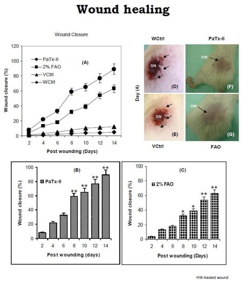 Wound healing effects of proteins in the mouse model. (A) S. aureus-infected wound treated with PaTx-II or fusidic acid ointment (FAO) shows enhanced healing when applied to mice at 0.5 mg/kg. Wound contraction was compared between the wound control (WCtrl) and vehicle control (VCtrl) mice. Control mice show severe necrosis (SN) and muscle damage after 4 days. (B) Percent reduction of wound after treatment with PaTx-II was analyzed between 2 and 14 days. The progress of the wound repair processes is indicated in days. (C) Post-treatment wound closure progression after treatment with 2% FAO (5 mice per group). HW represents the healing wound. Wound photographs: (D) Day 4, WCtrl. (E) Day 4, VCtrl. (F,G) Action of PaTx-II or FAO-completely healed wounds. (A–C) Data are the mean ± SD of 5 animals per group (n = 5) and represent three independent experiments. Statistical comparisons were performed with Prism 4.0 Software (Graph-Pad), using a two-tailed Student’s t-test for the comparison of two data sets, and ANOVA for multiple comparisons. Statistically significant differences are shown, with p values of * p < 0.05 and ** p < 0.01.