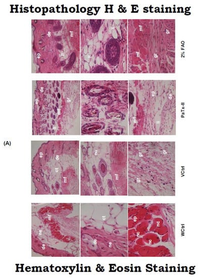 Mice were sacrificed by CO2 inhalation and wound tissue was harvested (~6 mm) from treated and controlled wounds at selected time points (2–14 days). Wound tissues were fixed in 10% formalin (Fisher Scientific, NJ, USA), processed for dehydration, embedded in paraffin (ParaplastTM resin), and cut in half. The embedded tissues were laid flat and cut with a single-edge razor blade placed vertically over the middle of the wound. Thin sections (8 µm) were stained with hematoxylin and eosin (H&E) [82,83]. For pathological evaluation, the sections were examined under a light microscope (Olympus, USA).