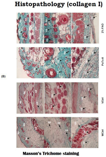Collagen I expression was examined by MT staining and was evident throughout the wound site of the skin. PaTx-II-treated wounds had the bundles of type I collagen lying parallel to the surface between the fibrinous exudates and granulating tissue (Figure 5D). Collagen expression was also higher in the 2% FAO-treated group versus controls. However, the collagen-I staining was not detected in either WCtrl or VCtrl controls.