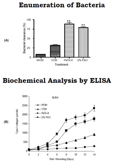 Wound fluid bacterial killing assay based on colony forming units (CFU/mL). (A) PaTx-II effectively inhibited the growth of S. aureus and completely cleared the growth of bacteria after 14 days versus the control. Graphical representation of wound fluid (WF) shows the percentage inhibition of bactericidal clearance after 24 h incubation at 37 °C. (B) Collagen accumulation and breaking strength of wounds were compared. New collagen accumulation was found in excised wounds and control skin. The difference between the curves was calculated, representing collagen accumulation. Statistical comparisons were performed with Prism 4.0 Software (Graph-Pad), using a two-tailed Student’s t-test for the comparison of two data sets, and ANOVA for multiple comparisons. Statistically significant differences from controls were observed for PaTx-II and FAO (p < 0.01; **).