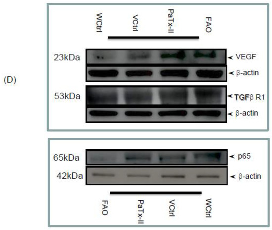 Alteration of collagen I expression in wounds was quantified by Western blot within the treated and control animals: WCtrl wound alone, VCtrl control, and infected wound treated with 0.5 mg/kg/day neutral gel, PaTx-II (0.5 mg/kg, b.w.) and 2% FAO (0.5 mg/kg, b.w.). Collagen I antibody formed a single band at a molecular mass identical to the positive collagen control (Figure 7A). Both PaTx-II-treated mice and 2% FAO-treated mice show a darker band for collagen I compared to the control mice. Untreated and infected wounds have higher levels of inflammatory markers (TNF-α, COX-2) and phosphor p65 14 days post-wound, as observed by Western blot analysis (Figure 7B,C). There was a significant up-regulation of vascular endothelial growth factor (VEGF), and transforming growth factor β (TGF-β) influenced faster neovascularization after the topical application of PaTx-II (Figure 7D).
