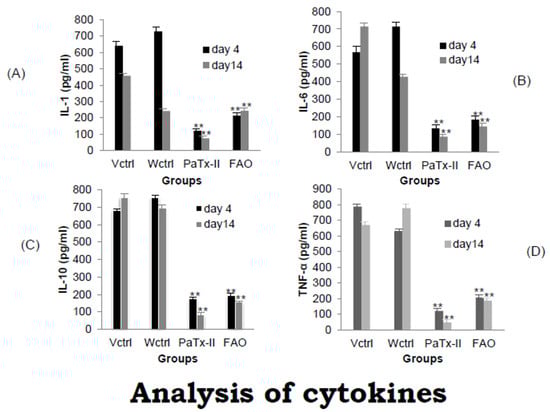 Proinflammatory cytokines were analyzed by an ELISA assay before and after wound treatment in mice. (A–D) There were increased levels of the cytokines IL-1, IL-6, IL-10 and TNF-α in untreated, infected wound-control mice, whereas both PaTx and FAO-treated mice show significantly decreased levels of all 4 cytokines after 4 and 14 days of treatment. For treated wounds, the PaTx-II-treated mice show a greater reduction of inflammatory cytokines after 4 and 14 days of treatment compared to the 2% FAO-treated mice. ** p < 0.01.
