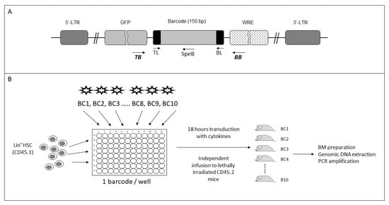 - Grosselin, J.; Sii-Felice, K.; Payen, E.; Chretien, S.; Tronik-Le Roux, D.; Leboulch, P. Arrayed Lentiviral Barcoding for Quantification Analysis of Hematopoietic Dynamics. Stem Cells 2013, 31, 2162–2171. [Google Scholar] [CrossRef] [PubMed]