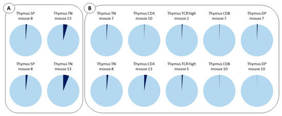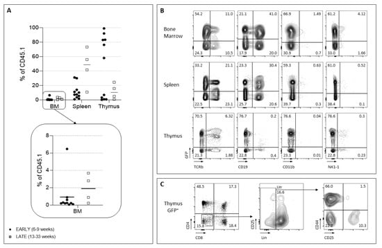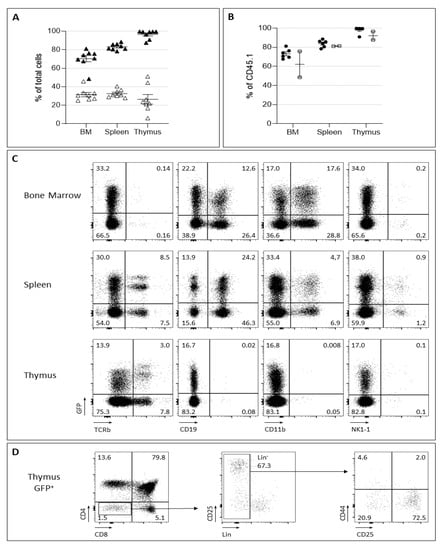 - Brugman, M.H.; Wiekmeijer, A.-S.; van Eggermond, M.; Wolvers-Tettero, I.; Langerak, A.W.; de Haas, E.F.E.; Bystrykh, L.V.; van Rood, J.J.; de Haan, G.; Fibbe, W.E.; et al. Development of a Diverse Human T-Cell Repertoire despite Stringent Restriction of Hematopoietic Clonality in the Thymus. Proc. Natl. Acad. Sci. USA 2015, 112, E6020–E6027. [Google Scholar] [CrossRef] [PubMed]