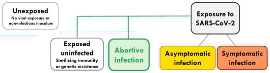 We wish to distinguish abortive seronegative infection (defined here as: subjects in whom viral replication and systemic antibodies remain undetectable) from a number of other distinct outcomes of viral exposure (Figure 1). These include: exposed individuals remaining uninfected due to (a) sterilising immunity, or (b) complete genetic resistance. Genetic resistance can be, for instance, due to a lack of expression of a key viral receptor [,,] (exemplified by CCR5-individuals resistant to HIV [], and low ACE-2 expression for SARS-CoV-2 []). Abortive infection is clearly distinguishable from asymptomatic infection or controlled chronic infection (e.g., HIV long-term non-progressors), where virus is detectable at some stage of the infection and where systemic antibodies are often generated. We would also like to distinguish it from infection with non-replicative virus (defective virions or antigen alone), occult or serosilent infection and late seroconversion (where viral replication is detectable), and finally from an abortive viral life cycle within an individual infected cell [] (Figure 1).