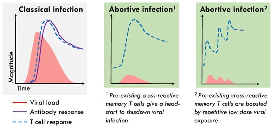 Although antibodies are typically expected to be induced before or around the time of T cells, shortly after the viral ramp-up phase (Figure 2), some studies [] have described delayed induction relative to T cells; this underscored the need for our prolonged follow-up sampling (weekly for 16 weeks, then six monthly for two years). For example, human challenge studies with influenza revealed unexpectedly early kinetics of virus-specific T cells, peaking a week after viral exposure, outpacing the antibody response which was only detected at the four-week time point []. In both this challenge study and a community-based influenza study [], rapid viral control resulting in only mild infection was attributed to pre-existing cross-reactive T cells, but subjects mostly did have detectable virus and subsequently seroconverted, thus not falling into our definition of abortive infection.