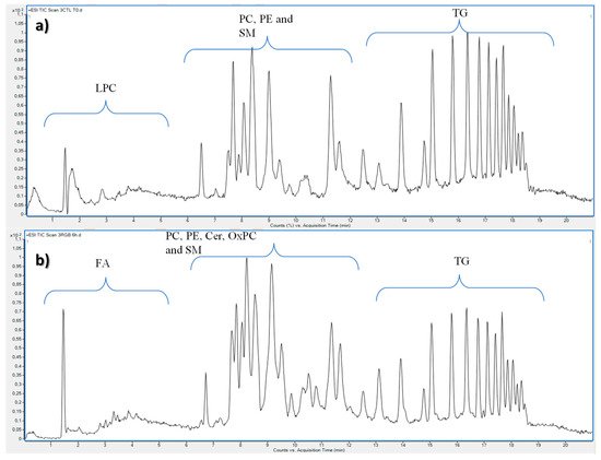 To investigate the erythrocytes’ lipid profile after clinorotation and to describe possible variations among the different lipid categories, samples were analysed by IM-QTOF-LC/MS and representative total ion chromatograms are shown in Figure 1.