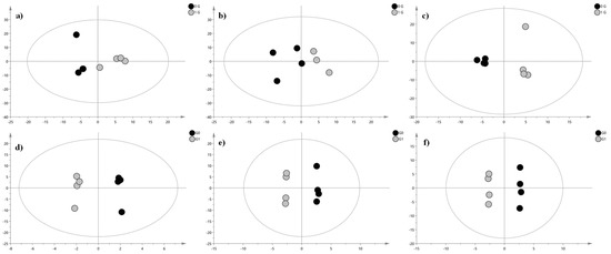 PLS-DA score plot. The grey circles represent the control samples, while black circles represent clinorotated erythrocytes samples. (a) 6 h clinorotated samples vs. 6 h control samples (PIA): R2X = 0.686, R2Y = 0.747, and Q2 = 0.434; (b) 9 h clinorotated samples vs. 9 h control samples (PIA): R2X = 0.849, R2Y = 0.945, and Q2 = 0.66; (c) 24 h clinorotated samples vs. 24 h control samples (PIA): R2X = 0.741, R2Y = 0.984, and Q2 = 0.421; (d) 6 h clinorotated samples vs. 6 h control samples (NIA): R2X = 0.776, R2Y = 0.994, and Q2 = 0.599; (e) 9 h clinorotated samples vs. 9 h control samples (NIA): R2X = 0.85, R2Y = 0.971, and Q2 = 0.147; (f) 24 h clinorotated samples vs. 24 h control samples (NIA): R2X = 0.692, R2Y = 0.995, and Q2 = 0.837.
