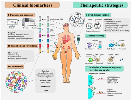 Exosome engineering through genetic and chemical methods for targeted drug delivery may help increase their therapeutic applicability as clinical biomarkers [7]. There are still a lot of aspects to be considered for the design of new cancer treatment strategies, but exosomes exhibit great potential in precision cancer medicine. Figure 1 is broadly depicting all clinical applications that exosomes may have.
