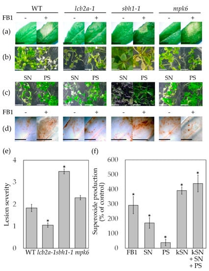 Long-chain bases and MPK6 are important positive regulators of PCD elicited by FB1 in Arabidopsis seedlings []. The response of mature wild-type and lcb2a-1, sbh1-1 and mpk6 plants to the FB1 infiltration was explored in leaves from 10- to 12-week-old plants (Figure 1a). In contrast to the damage observed in the wild-type plants by FB1 infiltration, lesions were reduced in the lcb2a-1 mutant, mkp6 showed a similar lesion severity to wild-type, and the sbh1-1 line showed enhanced lesions at 4 days after FB1 treatment (Figure 1a,e).