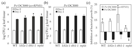 Similar to the treatment with FB1, infection of Arabidopsis wild-type seedlings with the avirulent Pst (avrRPM1) or the virulent Pst (DC3000) strains also evoked LCB accumulation []. While the avirulent interaction leads to a long-lasting elevation of PS levels, the increase in this LCB is transient in the virulent interaction (Supplemental Table S1) []. To examine whether the dihydroxy or trihydroxy LCBs and MPK6 were required to the immunity towards Pst DC3000 (avrRPM1), the bacterial growth was monitored in planta (Figure 2a). The Pst DC3000 (avrRPM1) titers inoculated at day 0 were the same in the different mutants and the wild-type seedlings, as proved by the quantitation of the bacterial population (empty bars). However, the growth of the avirulent strain increased 2.4, 6.08 and 5.41-fold in the lcb2a-1, sbh1-1 and mpk6 mutants at 2 days post-inoculation (dpi), respectively, as compared to the wild-type (notice the logarithmic scale). In the case of the virulent strain Pst DC3000, the initial bacterial titers inoculated to the wild-type and the three mutants were similar among them as well (empty bars) and comparable to the Pst DC3000 (avrRPM1) inoculated doses (Figure 2b). However, the increase in bacterial titers of Pst DC3000 observed at 2 dpi were statistically equivalent in all genotypes. Overall, this suggested that dihydroxy and trihydroxy LCBs and MPK6 are important regulators of the immune response unchained only by the avirulent strain.