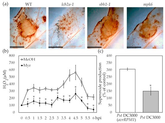 ROS generation at different stages of Pst DC3000 (avrRPM1) infection. (a) In situ detection of H2O2 in leaves from Arabidopsis wild-type, lcb2a-1, sbh1-1 and mpk6 adult plants infiltrated with 107 CFU/mL Pst DC3000 (avrRPM1). Images were captured at 3 dpi. A representative image from each condition is shown in panel (a), where independent experiments were replicated 3 times with a total of 6 plants and 12 leaves for each genotype and treatment. (b) Accumulation of H2O2 in the medium from Arabidopsis wild-type cell suspensions upon exposure to 107 CFU/mL Pst DC3000 (avrRPM1). Measurements were performed in the presence of a methanol dissolved myriocin solution or the dissolvent. (c) Formation of O2.−radical in Arabidopsis protoplasts upon addition of avirulent or virulent Pst strains at a concentration of 107 CFU/mL. Measurements were performed after 1 h. See Materials and Methods for details. The results show the means of percentage of the total amount produced in control protoplasts ± SD from three independent experiments. Scale bar corresponds to 0.5 cm. The two-tailed Student’s t-test was used for statistical analyses. Asterisks indicate significant differences compared to the solvent used in the myriocin solution (b) or to the avirulent strain (c) at p ≤ 0.05.