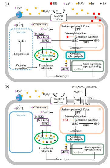 Schematic model of the action of the LCB surge induced by FB1 or by Pst DC3000 (avrRPM1), an avirulent strain. A rise of LCBs, mainly SN and PS, is produced upon addition of FB1 (a) or Pst DC3000 (avrRPM1) (b). This unchains an early oxidative burst by NADPH oxidase. The LCB rise promotes MPK6 activation. Downstream this kinase, an activation of the γVPE, produces vacuolar disruption and, in the chloroplast, a massive ROS production which leads to an irreversible PCD. Jasmonate, ethylene and salicylic-acid-defense-mediated pathways are also activated by MPK6 upon FB1 administration. γVPE, vacuolar processing enzyme; JA, jasmonic acid; PAMP, pathogen-associated molecular patterns; PRR pattern recognition receptors; SA, salicylic acid; TTSS: type III secretion system. PAMP, PRR and TTSS are identified elements expressed under the effector-triggered immunity (ETI).