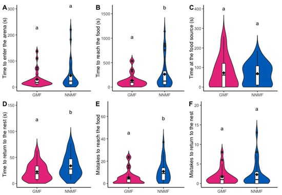 Foraging activity of Lasius niger under GMF and NNMF recorded during Phase 1. Violin plots show (A) the time spent by the first forager to enter the arena, (B) the time spent to reach the food source, (C) the time spent at the food source, (D) the time spent to return to the nest, (E) the number of mistakes made to reach the food source, and (F) the number of mistakes to return to the nest during Phase 1. The violin shape shows the distribution of the values, and the box plot inside is made by a black line in the center that indicates the median; the top and bottom of the black box represent the upper and lower quartiles; whiskers represent the maximum and minimum values, while the black dots indicate the outliers. Diamonds indicate mean values. Different letters indicate significantly (p < 0.05) different values based on generalized linear mixed model results.