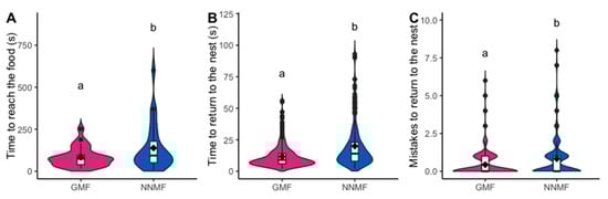 Foraging activity of Lasius niger under GMF and NNMF recorded during Phase 2. Violin plots show (A) the time spent by the first recruited worker to reach the food source, (B) the time to return to the nest by all workers that had fed for more than 30 seconds at the food source, and (C) the number of errors made while returning to the nest. The violin shape shows the distribution of the values, and the box plot is made by a black line in the center that indicates the median; the top and bottom of the black box represent the upper and lower quartiles; whiskers represent the maximum and minimum values, while the black dots indicate the outliers. Diamonds indicate mean values. Different letters indicate significantly (p < 0.05) different values based on generalized linear mixed model results.