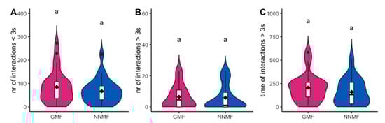Interaction events of Lasius niger under GMF and NNMF recorded during Phase 2. Violin plots show (A) the number of interactions lasting less than 3 seconds between two workers, (B) the number of interactions lasting more than 3 seconds between two workers, and (C) the time of interactions lasting more than 3 s between two workers. The violin shape shows the distribution of the values, and the box plot inside is made by a black line in the center that indicates the median; the top and bottom of the black box represent the upper and lower quartiles; whiskers represent the maximum and minimum values, while the black dots indicate the outliers. Diamonds indicate mean values. Different letters indicate significantly (p < 0.05) different values based on generalized linear mixed model results.