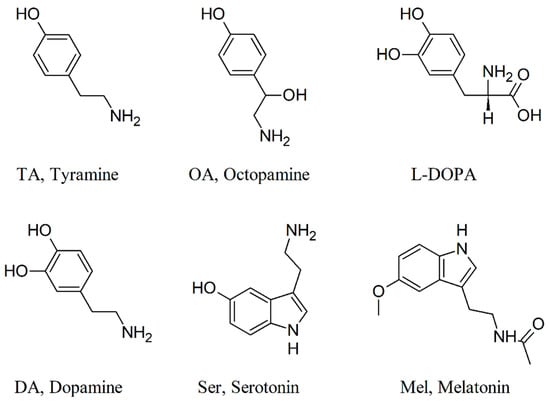 Biogenic amines (BAs) are compounds derived from amino-acid decarboxylation [52]. Although many of these compounds are known to function as toxins, some BAs are physiologically produced by organisms and function as key factors in several biological processes [42,53]. BAs are extremely diverse, but only a few have shown physiological importance in invertebrates, playing a different role with respect to vertebrates [35,37,38,54]. Consequently, we investigated whether the modulation of ant locomotor abilities by GMF, which affects the foraging performance, was correlated to qualitative or quantitative changes of the BA profiles in L. niger brains. We evaluated the content of those BAs that are known to modify invertebrate behavior, such as TA, OA, DA, L-DOPA, Ser, and Mel, using HPLC analysis coupled to mass spectrometry. Figure 4 shows the chemical structure of the BAs under study.