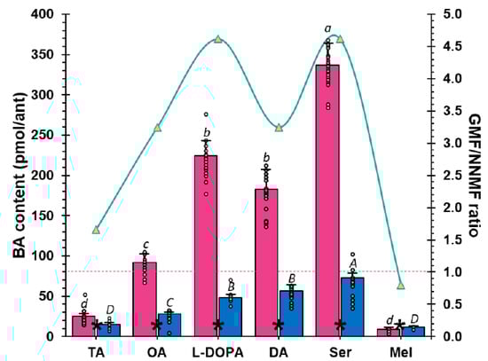 Differences in the average content of tyramine (TA), octopamine (OA), L-DOPA, dopamine (DA), serotonin (Ser), and melatonin (Mel) in black garden ants (Lasius niger) upon exposure to GMF (magenta bars) and NNMF (blue bars). Mean values are expressed as pmol·ant brain−1 (N = 30). For each series (GMF and NNMF), different letters indicate significant differences (p ≤ 0.05), as measured by Tukey's multiple interval test. The interpolation red line displays the GMF/NNMF ratio. The asterisk indicates a statistical difference between GMF and NNMF in the content of the relative BA. Metric bars indicate standard deviation. For further statistical analysis, see Supplementary Table S2.