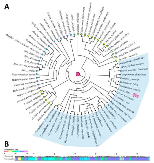 Phylogenetic analysis of the amino-acid sequence of MagR protein. (A) Phylogenetic tree of MagR originated from differences in amino-acid composition between Drosophila melanogaster (magenta dot in the center) and proteins identified in ants (blue shadow), bees (green dots), and wasps (yellow dots). The circular tree shows that the protein amino-acid sequences of phylogenetically close organisms are highly conserved, as suggested by their linking distance. The circular tree was originated by downloading the amino-acid sequences from NCBI, while the distance of each entry was calculated using BLAST tool as described in Section 3. (B) Sequence alignment of MagR in ants, wasps, and bees. Highly conserved residues among the analyzed species are shown in dark blue (>75% and <90%) or pink (>90%), while lowly conserved motif residues are colored in red, yellow, or green according to the conservation percentage (see percentage bar color legend).