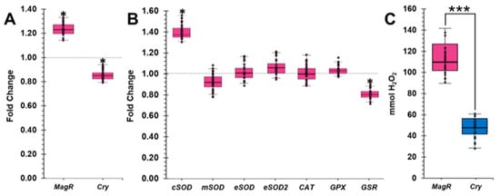 Effect of GMF on the gene expression of MagR and Cry (A), SOD, CAT, GPx, and GSR (B), or H2O2 content (C) of Lasius niger. For Panels A and B, Gene expression is expressed as fold change calculated as the GMF/NNMF ratio (N = 30). The dotted line represents the gene expression under NNMF condition, while bars represent the mean ± SD of three qRT-PCR biological replicates carried out in triplicate. For all panels, within each box the horizontal black lines indicate median values, while boxes extend from the 25th to the 75th percentile of the distribution of values in each group (N = 30). The extended vertical lines indicate the standard deviations. Asterisks indicate significant (* p < 0.05; *** p < 0.001) differences.